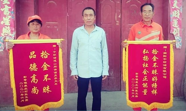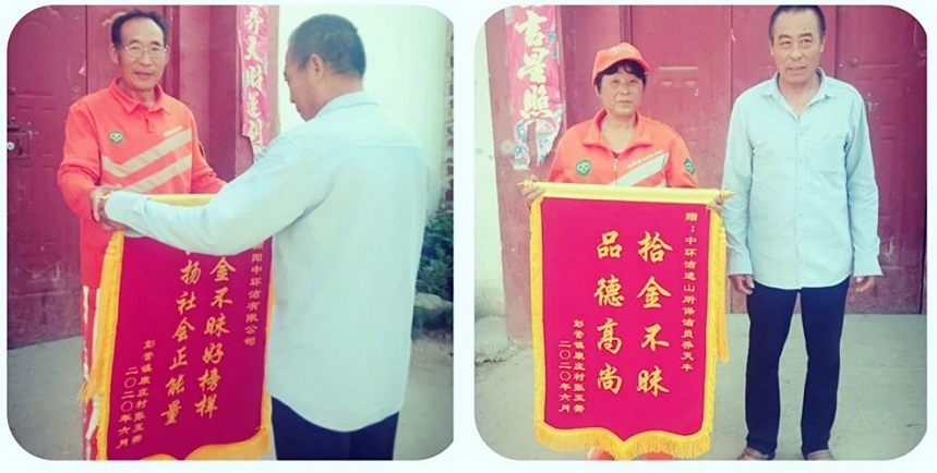 用專業守護環境,用真誠守護美好。近日,鎮平縣遮山鎮的一位村民帶著兩面分別印有“拾金不昧,品德高尚”、“拾金不昧好榜樣,弘揚社會正能量”的錦旗到南陽中環潔遮山掃保所尋找環衛工人喬天豐,要向他及南陽中環潔公司致謝。